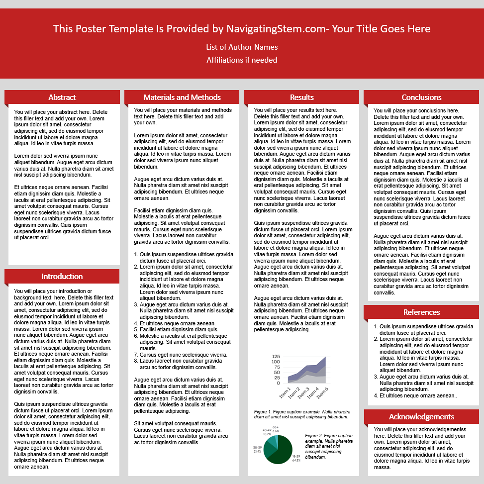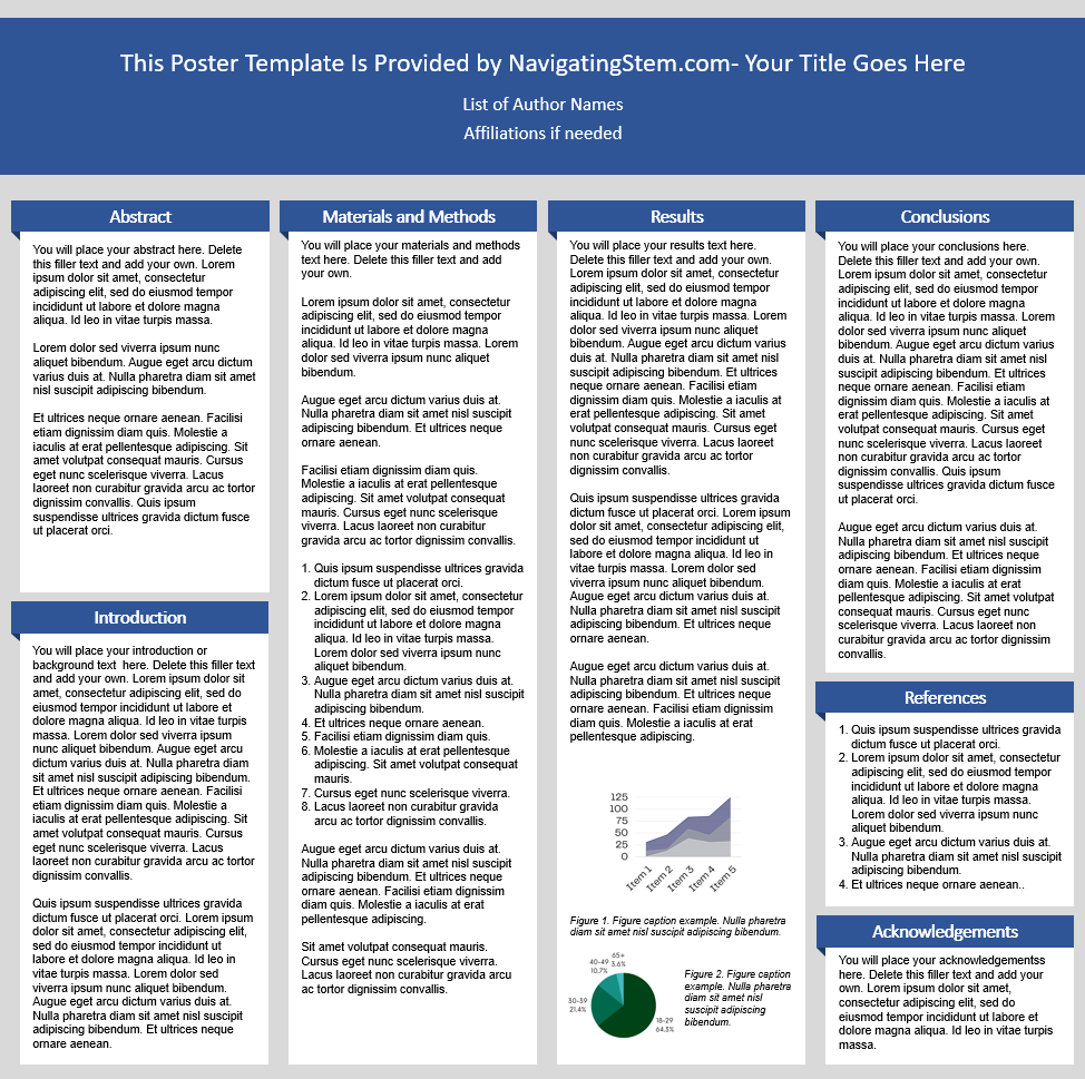 Click on the link of any poster template to download the Powerpoint slide. You can easily edit the filler text and insert your figures into the template provided.